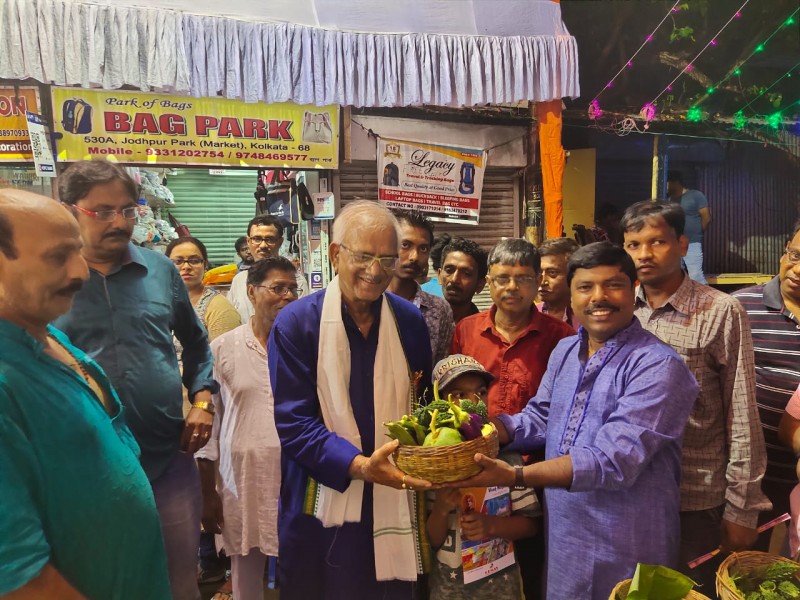 Founder of Mukti, Shri Sankar Halder is honouring Shri Sobhandeb Chattopadhyay, Hon'ble Ministry of West Bengal, Department of Power with bunch of Organic vegetables, produced by Marginal Organic Farmers of Sunderban.